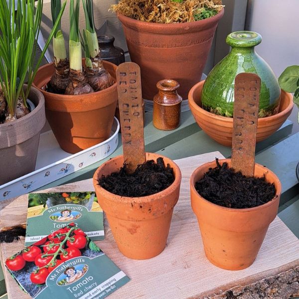 Following on from our bumper crop last year, we’re sticking with the ‘Red Cherry’ and ‘Garden Pearl’ varieties of tomatoes this year. Both sets of seeds have now been sown and are now waiting to germinate on the kitchen windowsill.