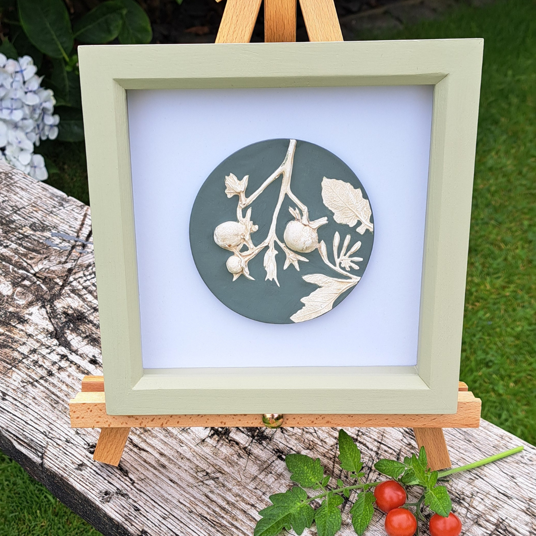 This framed bas relief casting of cherry tomatoes and plants is one-of-a-kind and shows the simple beauty of nature whilst capturing a moment-in-time in the summer vegetable garden.